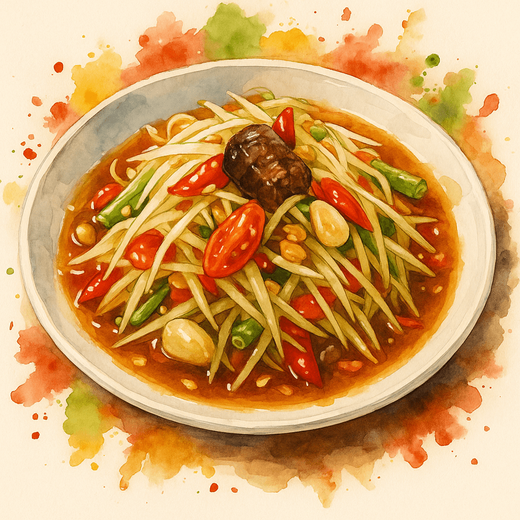 Green papaya, fermented fish sauce, anchovy, lime, chili, tomato, Thai eggplant